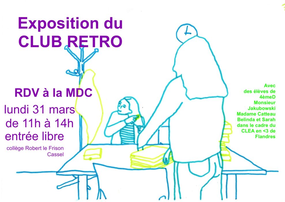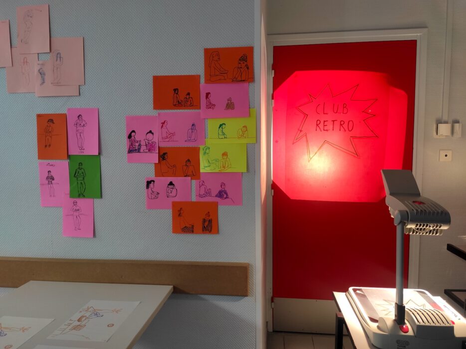 CLUB RÉTRO est un atelier mené avec des élèves d’une classe de 4ème du Collège Robert le Frison à Cassel, avec la documentaliste de l’établissement et le professeur d’histoire-géo, autour de pratiques visuelles, sonores et cartographiques empruntées à l’univers de la projection et de l’archive. À partir d’objets techniques “désuets” trouvés dans le collège, rétroprojecteurs, platines vinyles, cartes IGN, mais aussi parc informatique, matériel de diffusion sonore, nous avons exploré des formes de narration mêlant dessin animé sur papier, cartographie poétique, poèmes géographiques, fonds d’écran et paysages sonores. Le projet a donné lieu à une restitution immersive au sein du collège, et a été réalisé dans le cadre d’une résidence-mission CLEA en Cœur de Flandre.